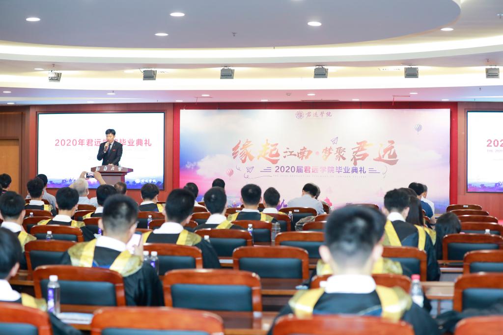6月21日下午,yl23455永利官网君远学院2020届毕业典礼在我校图书馆五楼报告厅隆重举行。原无锡市政协副主席雷焕文、yl23455永利官网副校长张凌浩、无锡市委统战部副部长赵俊明、原yl23455永利官网副校长王武、yl23455永利官网党委办公室主任朱飞、校长办公室主任张梁、教务处处长徐学明、社会资源处处长黄敏等领导和嘉宾,以及yl23455永利官网、君远学院全体领导班子和机电系教师、院学工办教师代表出席了典礼,与君远学院2020届全体在校毕业生共同见证逐梦远航的美好时刻。典礼由君远学院辅导员高鑫主持。