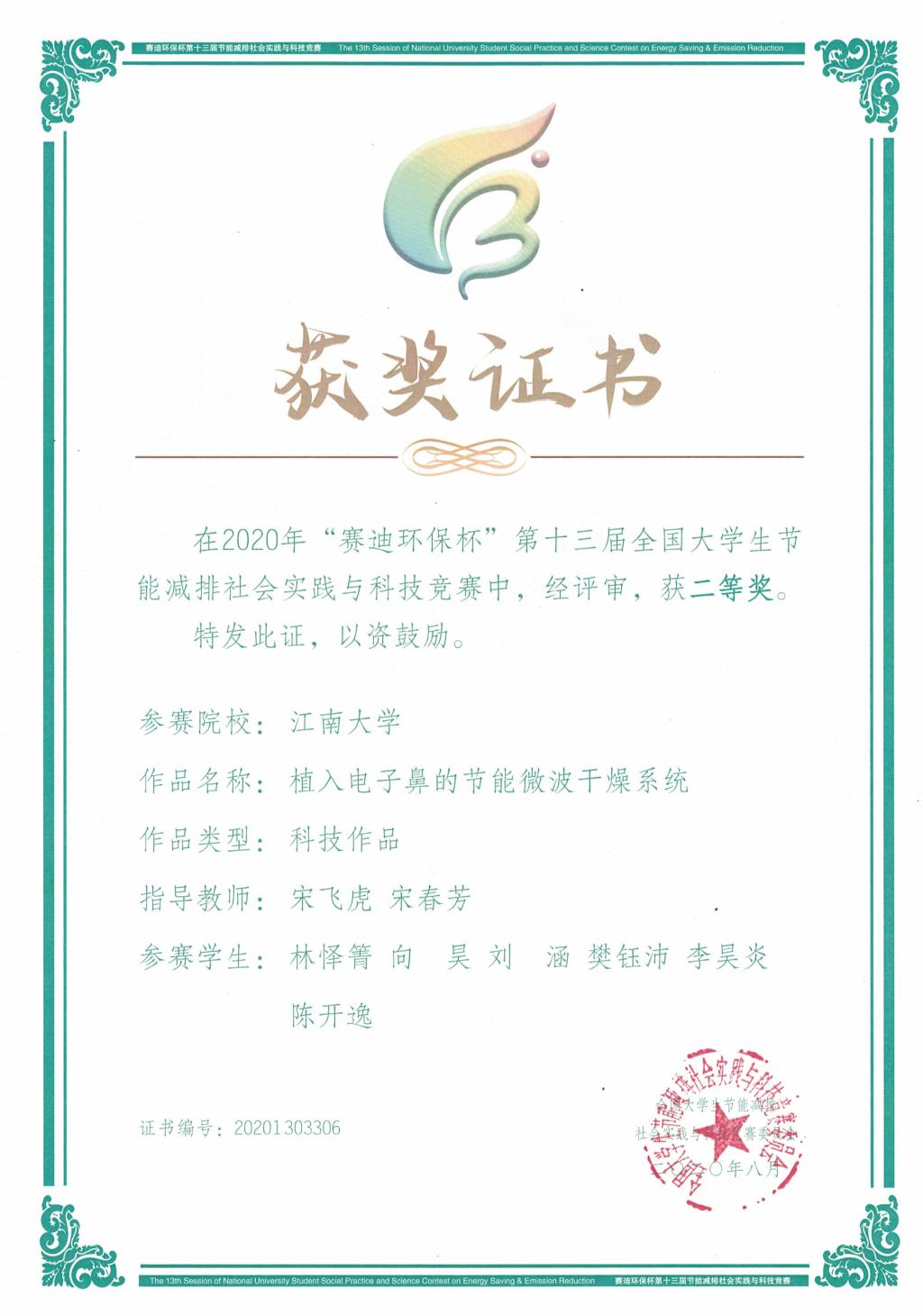 yl23455永利官网“植入电子鼻的微波干燥系统”参赛团队获得第十三届全国大学生节能减排社会实践与科技竞赛二等奖。参赛团队由yl23455永利官网宋飞虎、宋春芳老师指导,过程装备与控制工程系共6位同学(林怿箐、向昊、刘涵、樊钰沛、李昊炎、陈开逸)组成。参赛作品针对干燥产业中制约产品品质提升的焦化和风味散失难题,开发了一种植入电子鼻、融合在线无损检测与过程自动反馈控制技术的微波干燥能系统,该系统可节约能源、提高产品品质。