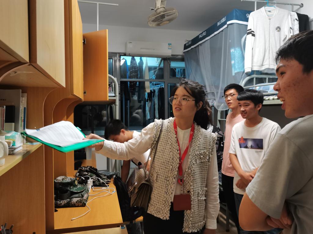 学院对各宿舍物品摆放、床铺整理、地面卫生打扫及公共区域卫生情况进行检查,绝大多数宿舍内务良好,物品摆放整齐划一,整体卫生情况基本达标。对此,辅导员潘智琦提出表扬,期望学生继续坚持改进,好好把握军训这一锻炼机会,为后续建立良好生活、学习氛围打下基础。对于部分存在的不足之处,退伍老兵杨飞龙提出了整改建议,详细指导学生被子叠放、常用物品摆放方法,要求相关宿舍及时做出整改。在指导新生过程中,针对学生反馈的各种问题,班主任和副班们作为前辈也给出了相应的解决方案,让他们更清楚地了解宿舍内务的各项标准与注意事项。
